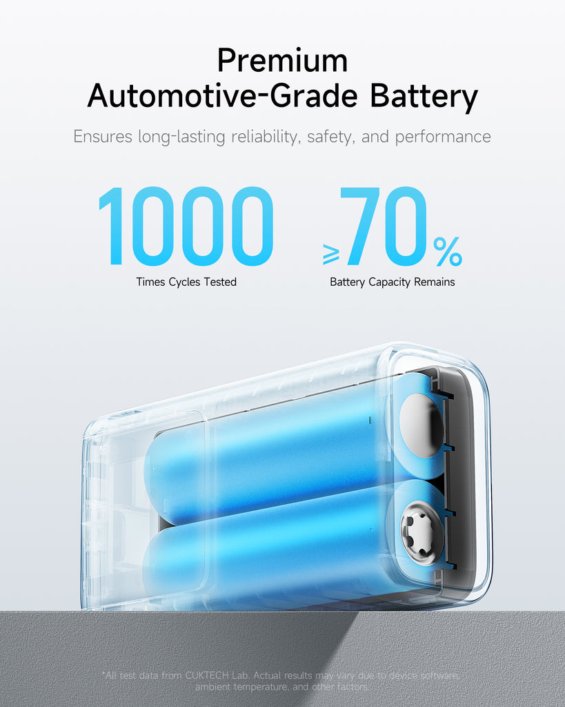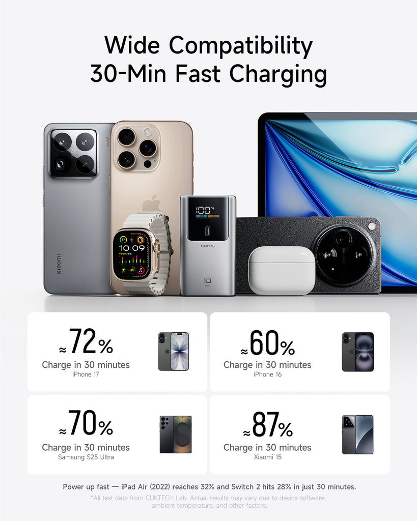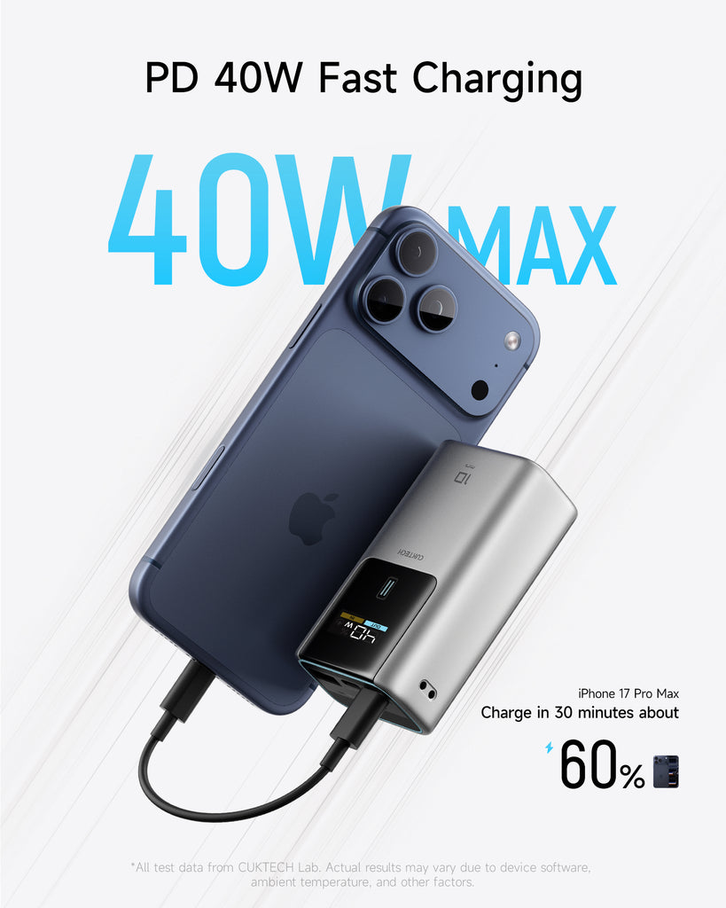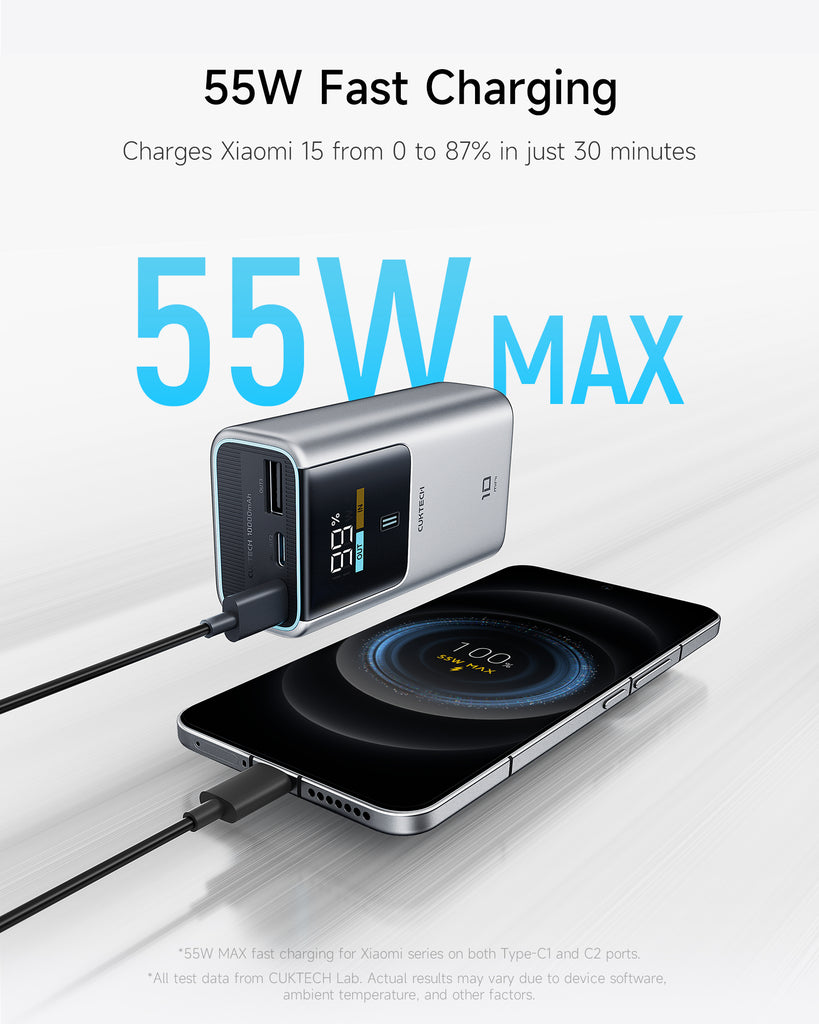 55W MAX Two-Way Fast Charging: Charge efficiently and stay productive anytime, anywhere. In just 30 minutes, it powers iPhone 17 Pro to about 69%, Samsung S25 Ultra to about 68%, Xiaomi 15 to about 87%, Honor 200 to about 70%, and OPPO Find X8 to about 52%. Supports 55W self-charging as well, fully recharging the power bank to 100% in just 1.5 hours.