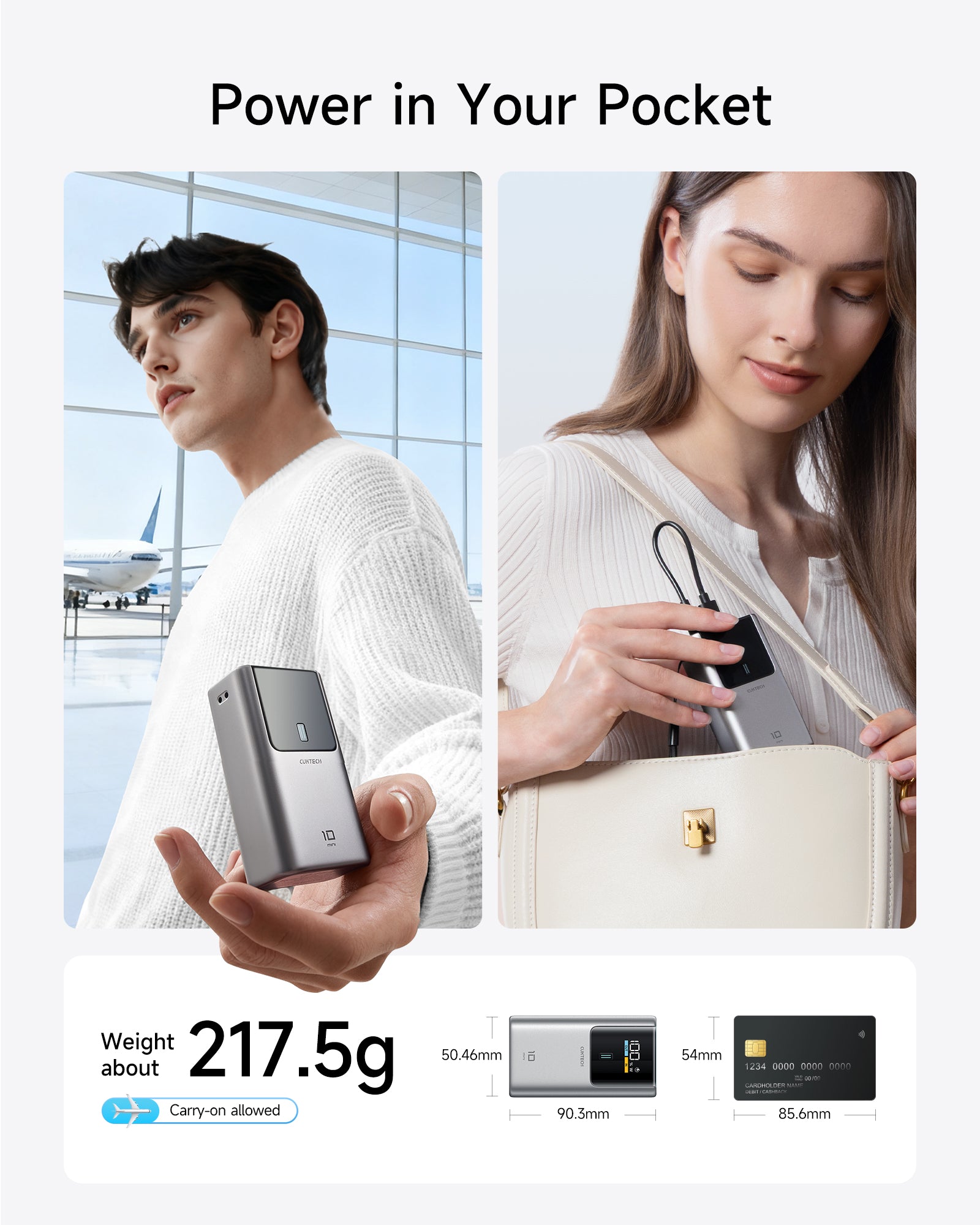 Pocket Size with 10,000mAh Big Capacity: Equipped with a high-capacity 10,000mAh battery, this ultra-compact power bank has a surface area about the same as a credit card, and weighs only 217 g. It easily fits into pockets or bags, truly pocket-friendly and airline-approved for all your trips, providing enough power to keep your devices running all day.
