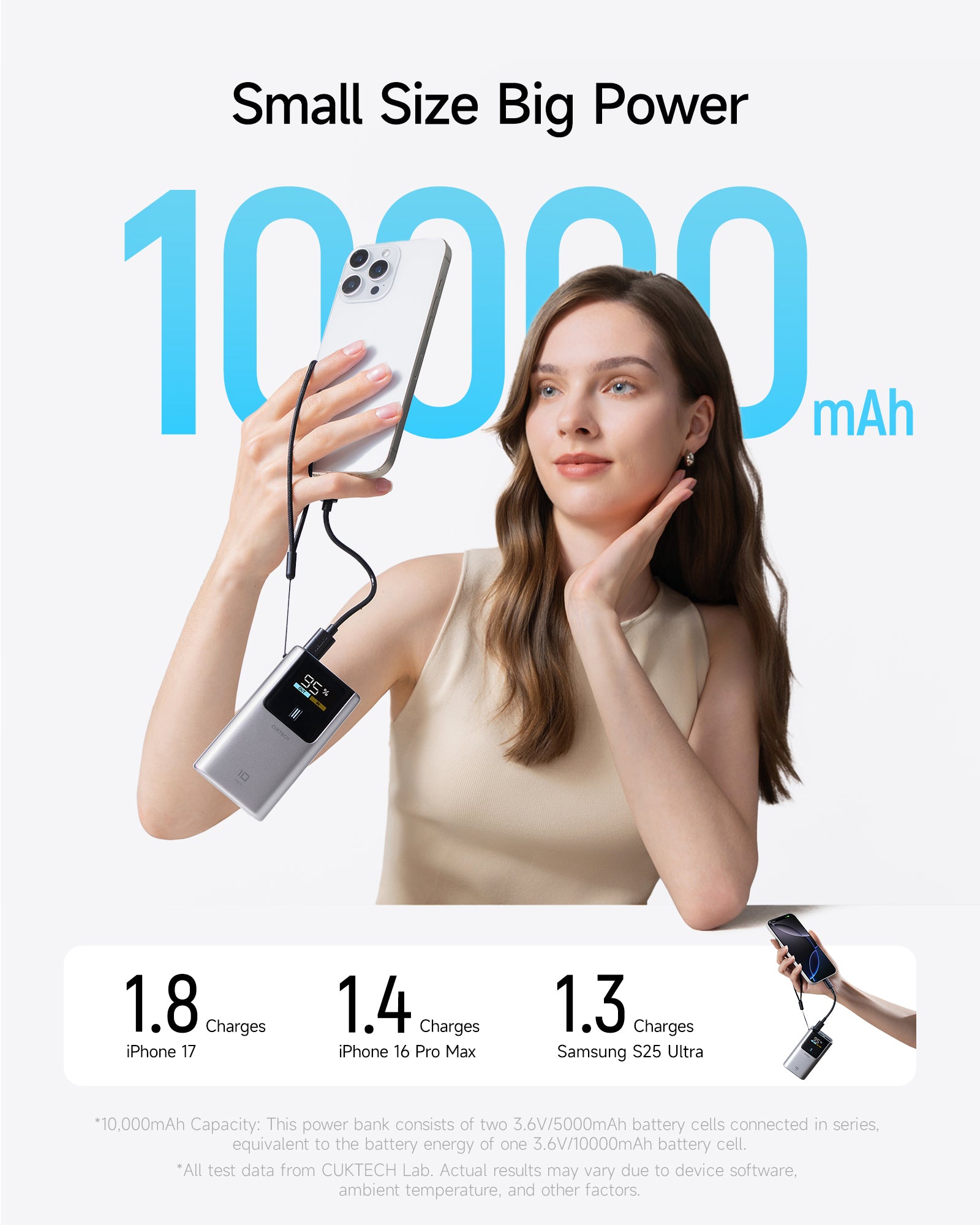 What You Get: CUKTECH 10 mini Power Bank 55W, user manual, 1 x 15cm ultra-short charging cable, 24-month stress-free warranty and friendly customer service.