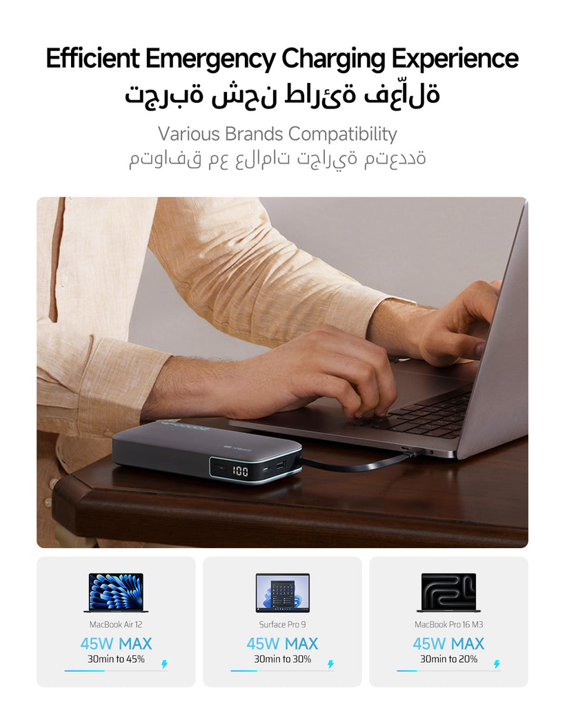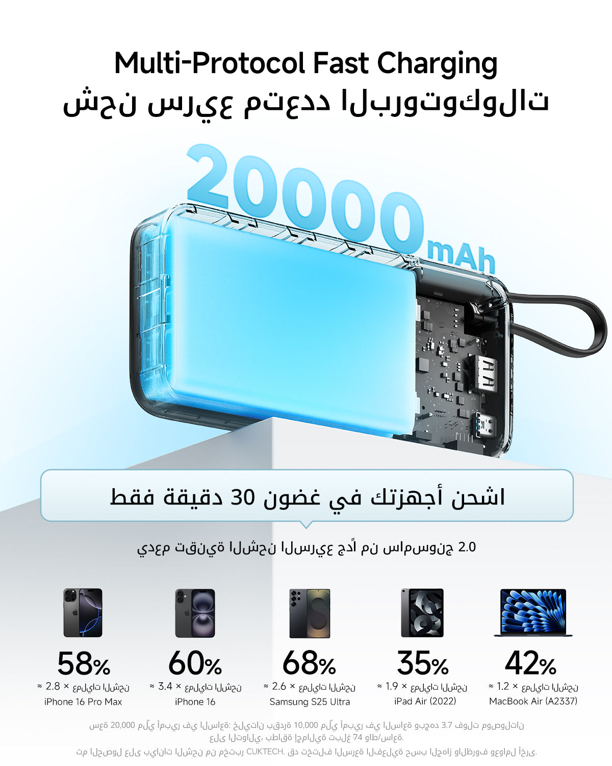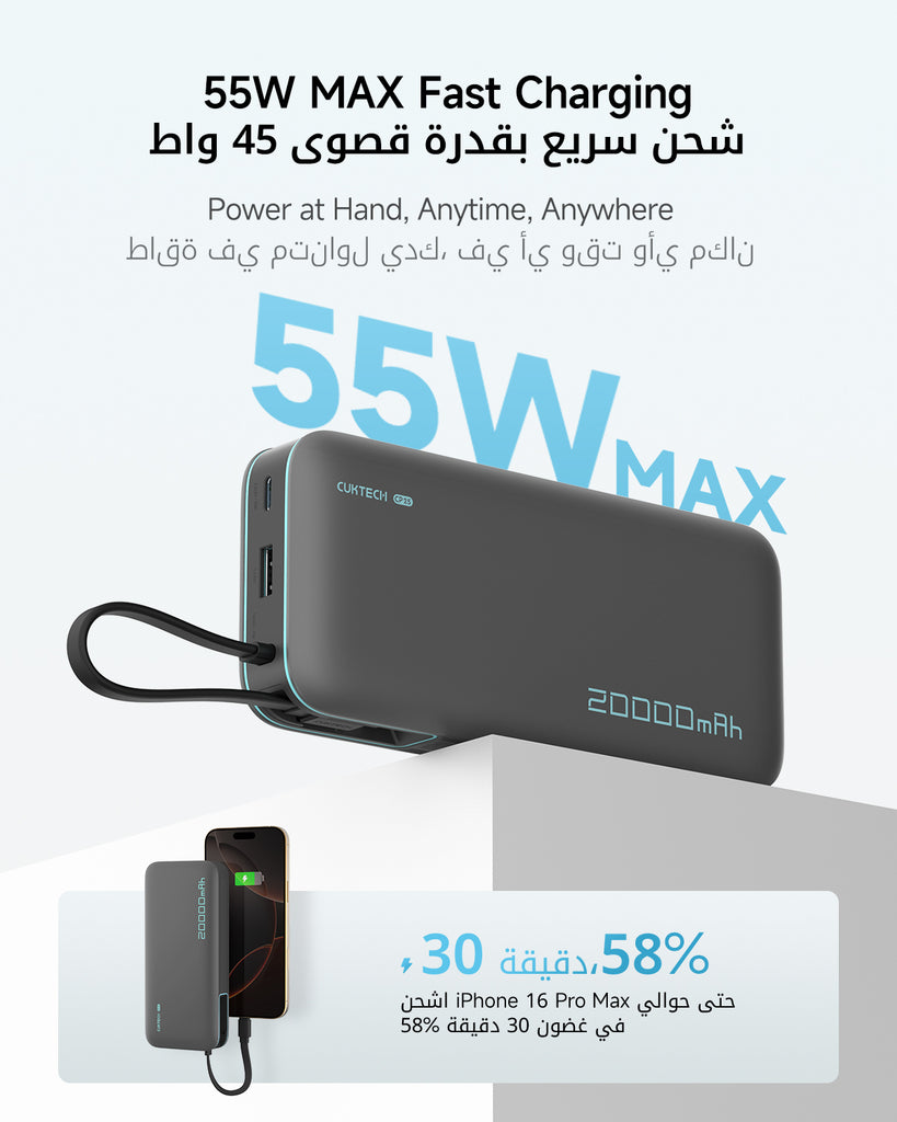 45W Super Fast Charging : The CUKTECH 20,000mAh Power Bank delivers rapid 45W output, quickly charging your iPhone 15 Pro Max, MacBook Air, or Samsung Galaxy S24 Ultra etc. With this ultra-fast 45W Portable Charger, Capable of powering your Samsung S24 Ultra to 50% in just 20 minutes.