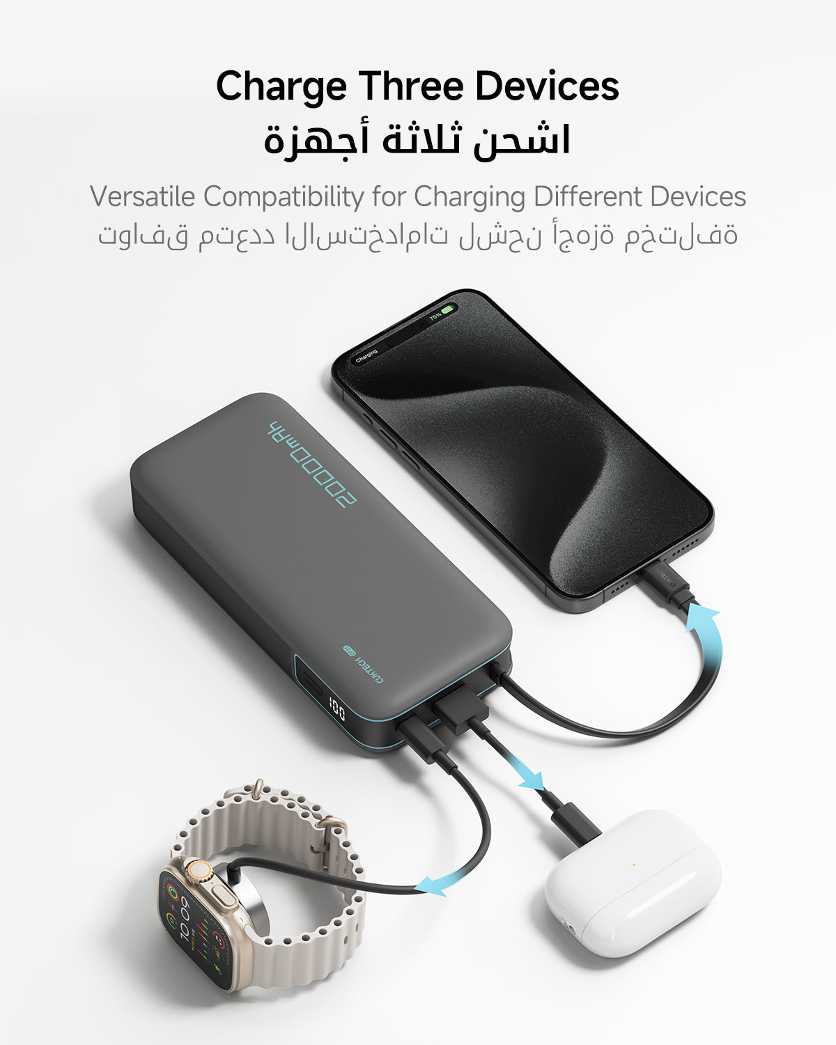 Multi-Device Charging: Featuring 3 output ports and 2 input ports, this power bank can charge up to three devices at once. Perfect for emergency power needs, it ensures your phone, tablet, and other gadgets stay charged and ready whenever you need them.And the CUKTECH power bank meets safety certifications such as UL, CE, CB, and FCC etc, which provide a better and safer charging experience.