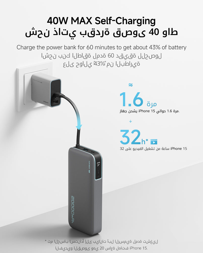 40W Lightning-Fast Recharging: In just 30 minutes, power up your MacBook Air(A2337) to 42% or your Samsung S24 Ultra to 70%. The USB C power bank recharges up to 43% in just 60 minutes with 40W PD adapter, providing enough power to charge your iPhone 15 approximately 1.6 times. Experience unparalleled charging speed for your devices.