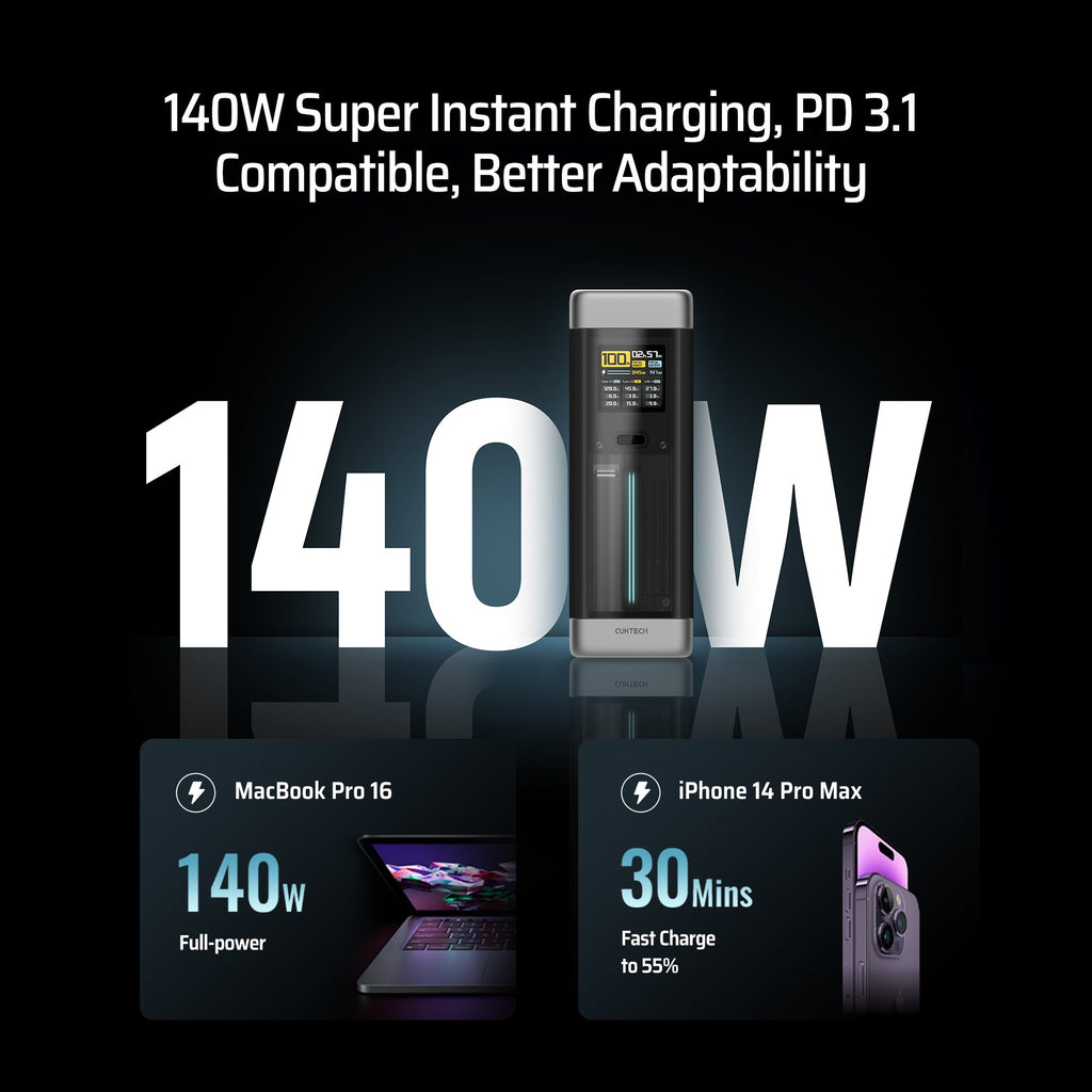 High-Efficiency, Quick Charging Capability: CUKTECH 20 Power Bank delivers 140W of power, fully compliant with the latest PD3.1 charging protocol. It eliminates the inconvenience of sluggish charging, offering a quick-charging solution tailored for devices such as MacBook Pro. Compared to ordinary high-power chargers, it's in a league of its own.