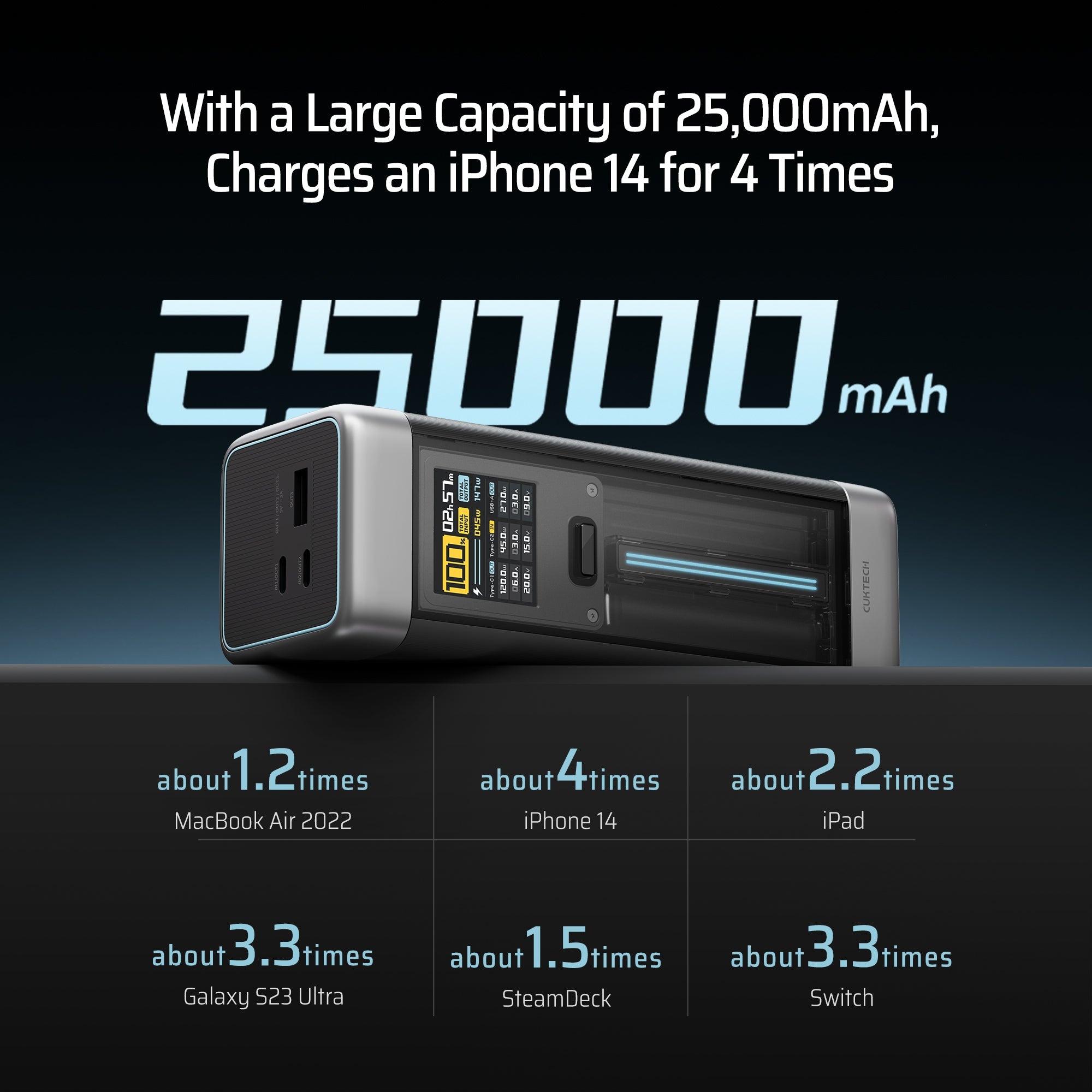 Mega Battery Life: Packed with a Auto-Grade battery, it's built to last with over 1000 charge cycles. That's over three times the lifespan of ordinary power banks. With its reliable 25000mAh power source, the portable charger can charge your MacBook Air 1.2 times or your iPhone 15 up to 4 times. It's the power you can count on.And the CUKTECH power bank meets safety certifications such as UL, CE, CB, and FCC etc, which provide a better and safer charging experience.