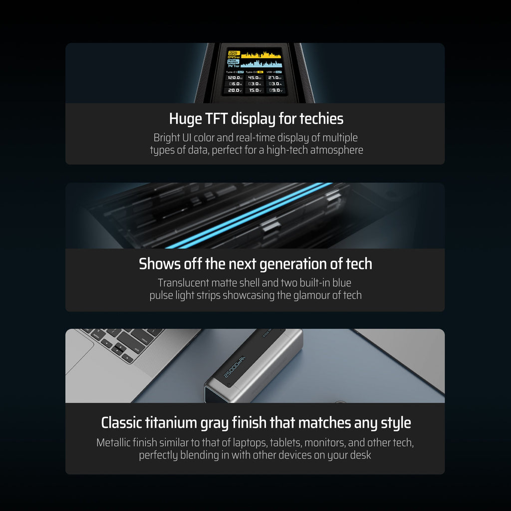 Smart TFT Display: Featuring an intuitive TFT display, it keeps you informed with real-time info like battery level, power, voltage, and current. Stay in control and stay engaged with your power bank. The graphical display makes understanding its status a breeze.
